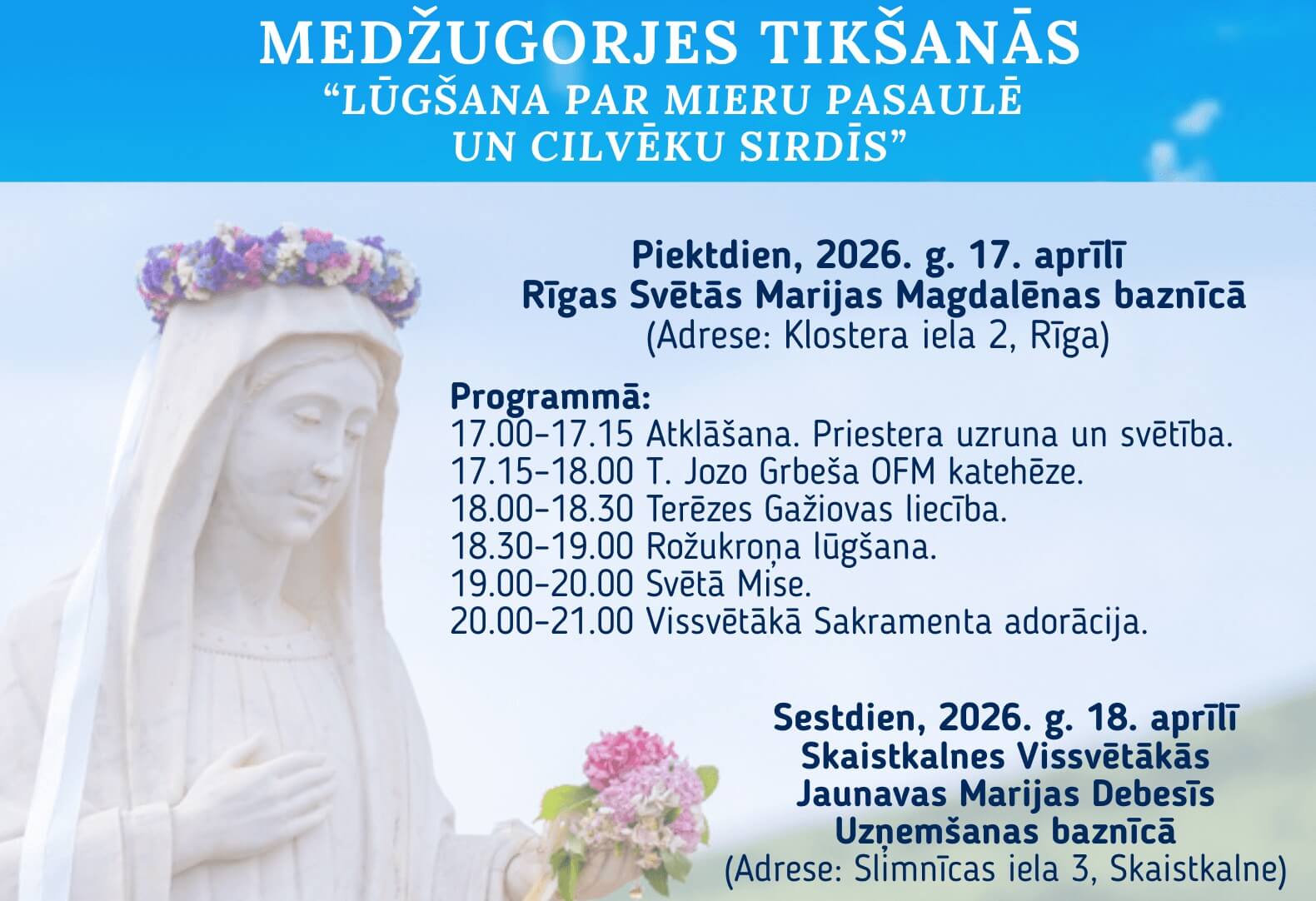 “Mīļie bērni! Šajā žēlastības laikā es jūs atkal aicinu veltīt savu dzīvi Dievam, lai, jums personiski atgriežoties, Viņš jūs vadītu uz augšāmcelšanos. Bērniņi, Dievs ir jums tuvu un uzklausa jūsu lūgšanas, bet jūs esat iemiguši, tāpēc Viņš mani sūta pie jums, lai es jūs uzmodinātu un jūs mirdzētu svētumā kā pavasara ziediņš. Paldies, ka atbildējāt...
